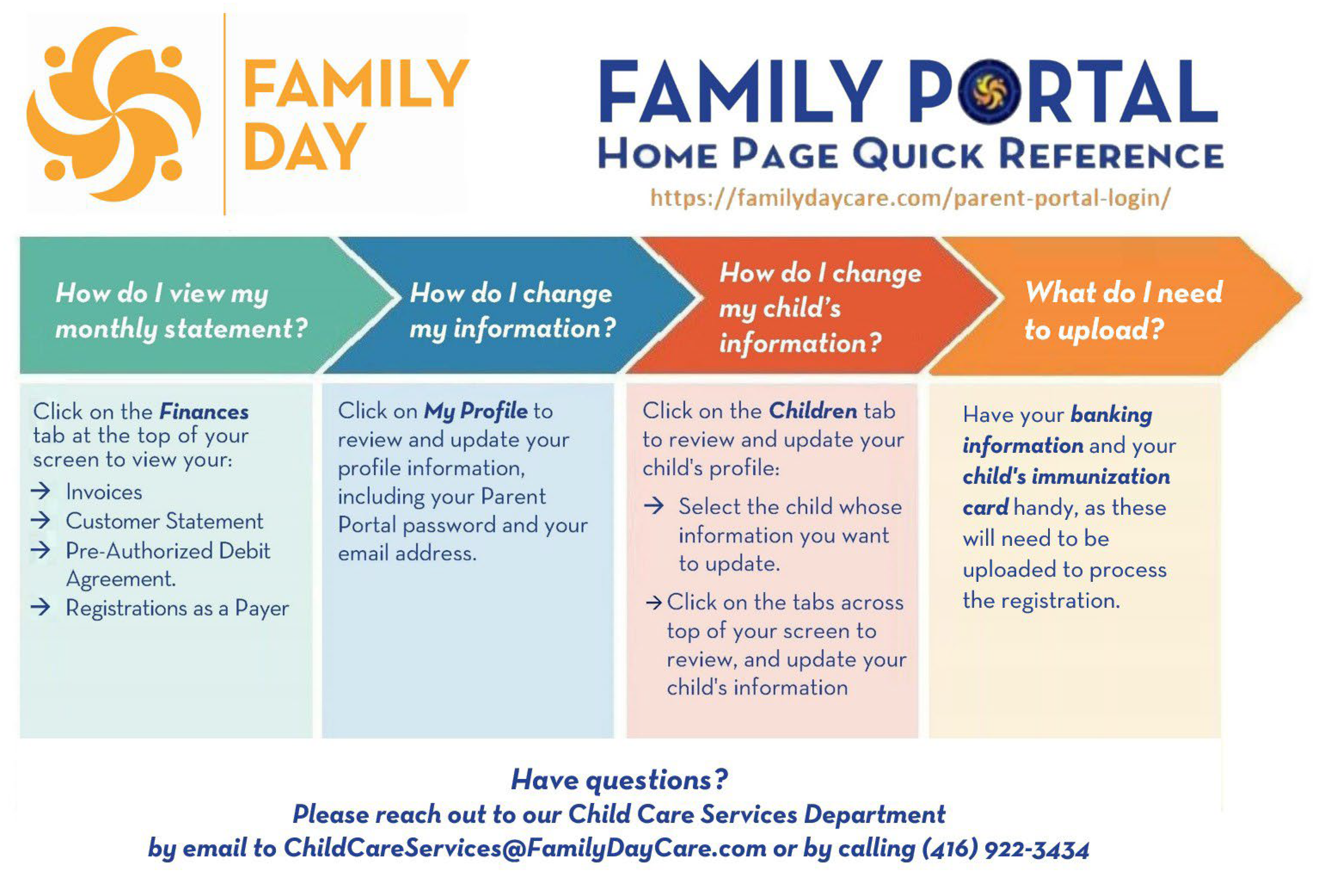 The instructions will guide you to our online Parent Portal and provide you with the information you need to create an account, enter information for your child, and indicate which sites and programs you want to go on the waitlist for. If you need further information or assistance, you can also speak with one of our Child Care Services representatives by calling 416-922-3434 | 1-800-263-9703 or emailing childcareservices@familydaycare.com, between 8:30 AM to 4:30 PM, Monday through Friday. Should they be unable to take your call, please leave a message and they will respond as soon as possible.