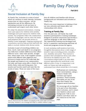 Social Inclusion at Family Day. At Family Day, inclusion is a state of mind which we continue to work towards. Inclusion means that we value everyone—all the similarities and all the differences. By welcoming everyone we all can learn to understand...