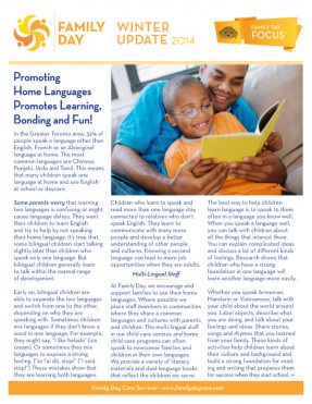 Promoting Home Languages Promotes Learning, Bonding and Fun! In the Greater Toronto area, 32% of people speak a language other than English, French or an Aboriginal language at home. The most common languages are Chinese, Punjabi, Urdu and Tamil. Thi...