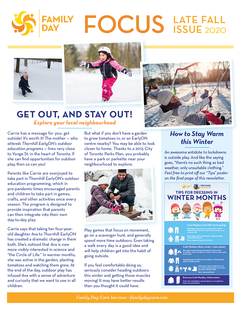 We are well into the fall/winter season and this year many of us have had a new and valued appreciation for the great outdoors and enjoying nature. Family Day staff across our programs have certainly taken advantage of opportunities to be outdoors. This fall, we have strengthened our commitment to outdoor education and, as demonstrated on our social media feeds, staff are working hard to keep children happy and engaged outdoors in nature. It all certainly looks like fun! Health experts remind us about the benefits of the outdoors for everyone. They include fresh air, physical activity, connecting with nature and, of course, the benefits to our mental health.