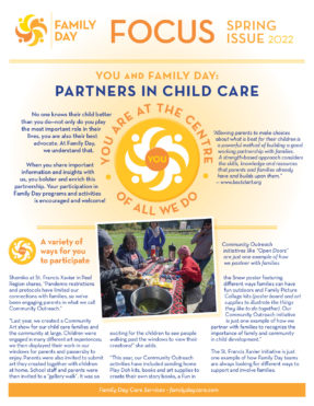 Warm Winter Greetings! In this issue of FOCUS, we are shining the spotlight on the many benefits of choosing licensed child care. Licensed facilities adhere to ongoing rigorous regulations through the Ministry of Education’s licensing system, Fam...