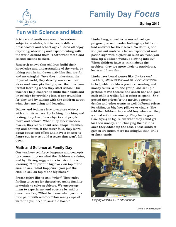 Research shows that children build their knowledge and understanding of the world by taking part in hands-on activities that are fun and meaningful. Once they understand the physical world, they develop more complex ideas and concepts that prepare them for more formal learning when they start school. Our teachers help children to build their skills and knowledge by providing lots of opportunities for play and by talking with the children about what they are doing and learning.