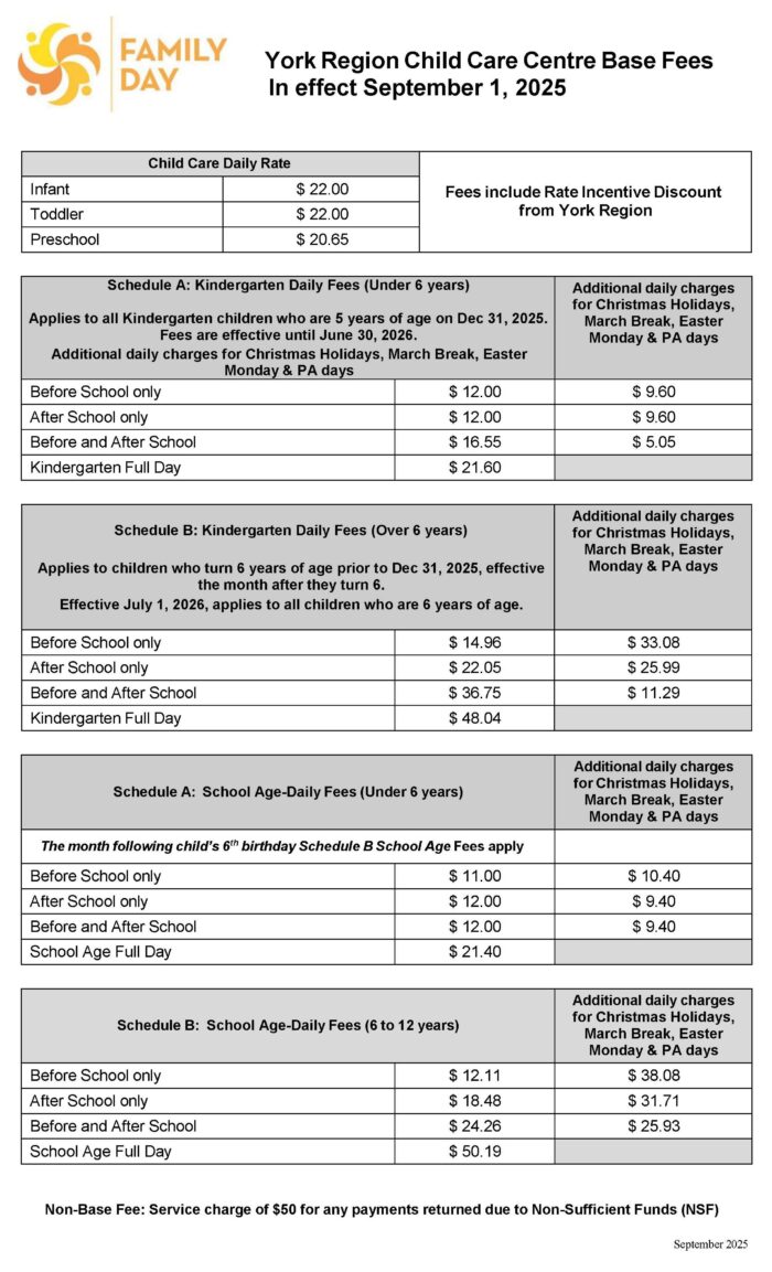 For information on a child care fee subsidy, please contact the Regional Municipality of York’s Integrated Children’s Services Department