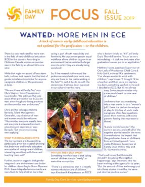 Each day across our agency, our dedicated educators work to create a sense of belonging, well-being, and engagement for the children in our programs. The majority of this work is carried out by females, but in this edition of FOCUS we highlight a sma...
