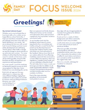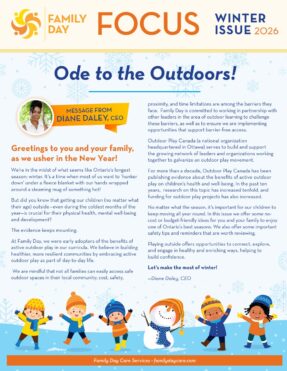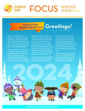 Warm Winter Greetings! In this issue of FOCUS, we are shining the spotlight on the many benefits of choosing licensed child care. Licensed facilities adhere to ongoing rigorous regulations through the Ministry of Education’s licensing system, Fam...