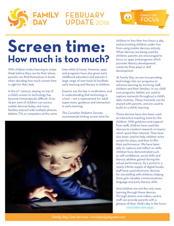 Welcome to 2016! The world of early learning and child care continues to evolve and transform with another set of regulation changes potentially arriving from the provincial government over the next couple of months. Family Day continues to work through the previous regulation changes for both our licensed home child care programs, and for our centre-based child care and school age programs. Through all this, our goal continues to be that of maintaining excellent program quality, and ensuring that children and families enjoy the programming they attend.